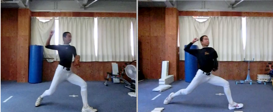 先ず最初に足の踏み出す幅に変化が出て、白いラインを越えるようになりました。また自分の中で、股関節の体重の乗り方にも変化を感じました。トップの位置も、より耳に近い所に来て、そこから投げれるようになりましたし、リリースポイントの位置もさらに前になりました。最初とは想像もつかないほど良いフォームになりました。